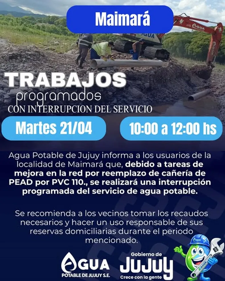 Agua Potable de Jujuy comunicó que este martes 21 de abril habrá una interrupción programada del servicio de agua potable en la localidad de Maimará, La quiaca y en San Antonio, debido a tareas de mejora en la red.